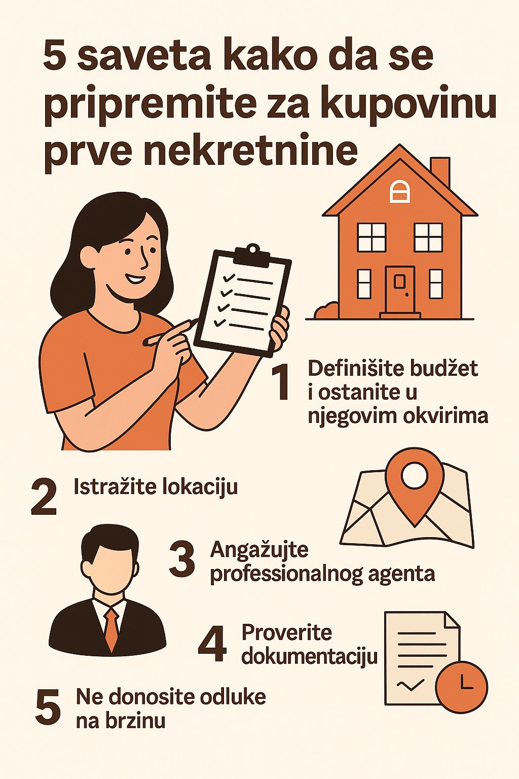 Kupovina prve nekretnine je jedan od najvažnijih koraka u životu – i često dolazi s puno pitanja, nedoumica i stresa. Bilo da kupujete stan za život, kuću za porodicu ili nekretninu kao investiciju, dobra priprema može značiti razliku između pametne odluke i skupih grešaka. Evo 5 ključnih saveta kako da se pripremite: